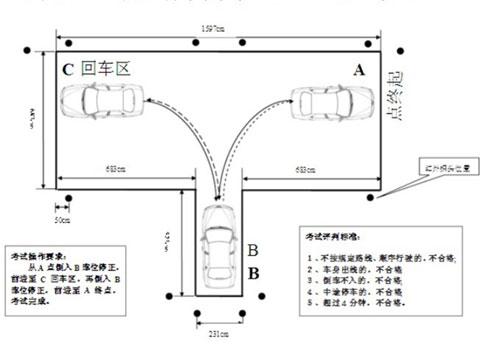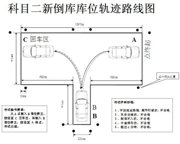 首先,这张图是倒库考试的示意图,大概是一个“凸”字的结构。左右两边都有一条横向的控制线(从车里看),考试车一开始停在右侧的控制线之前,在整个倒库过程中,车的前轮必须分别压过左右两边的控制线,中间不能碰到任何一条线,停车位置要标准,中途不能停车,车子转出来左右两边,压过控制线的时候车子必须是正的,这是大概的要求。