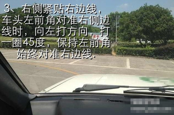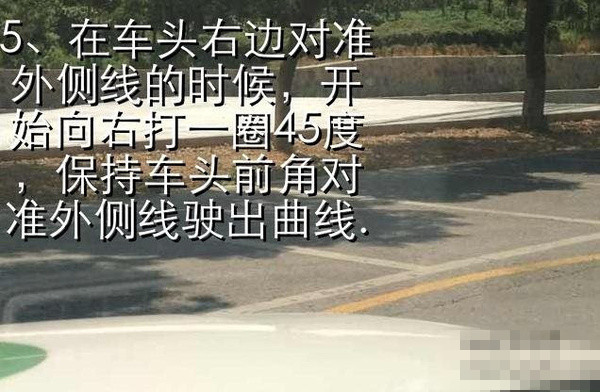 当你慢慢的走完第一弯的右线,方向要不动,等到左车角碰到第二弯左线时回正方向,一圈45度,这个时候要让车再慢慢的走一会。